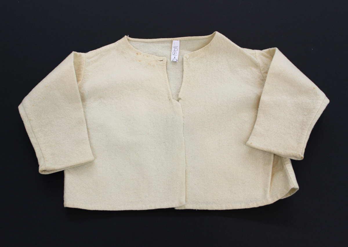 Cream-colored wool long sleeve child's undershirt, scoop neckline, hand-stitched. Center front opening with buttons.
