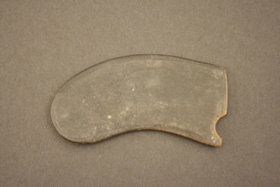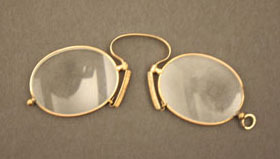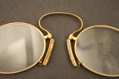 Black case, paper covered in leather. Glasses have gold frame with clear glass. Prominent bridge that rises above lenses. Nose rest pieces on inner side of each lense. No bows. Small ring on one side.