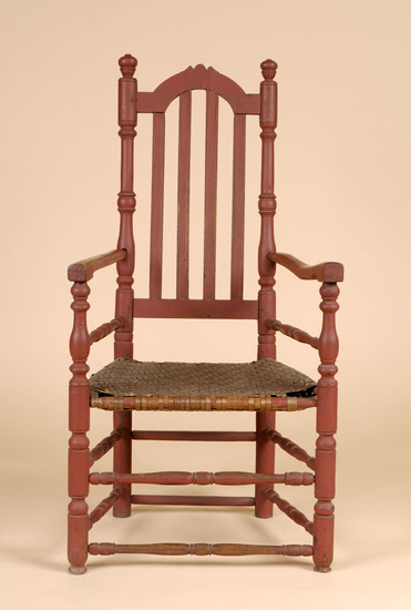 Bannister back arm chair; cane seat; painted red; front legs have pad feet; two front stretchers with ring and sausage turnings, same for double side stretchers; double plain round back stretchers; back legs round through seats; left arm with straight undercut round top; right arm different wood undercut with shallow curve; back stiles fancy turning and canted back ending in vase, ball and button finial; top rail straight ends with arched center and crown top; bannisters falt back, beaded and grooved center front (4 bannisters)