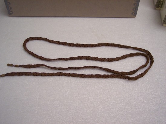 Braided silk watch chain, has a brass catch and loops. Belonged to Mr. John Waters.