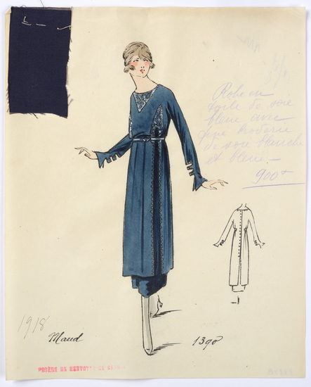 Lithograph and watercolor on paper fashion design. Blue silk dress with delicate embroidery of white and blue silk. Fabric samples accompany rendering.