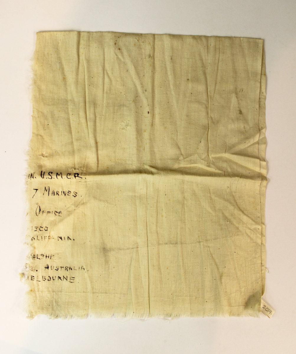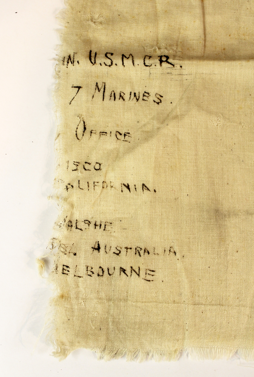 Off-white wool fabric remnant, World War II era. Fringed edges on three sides, selvage on right edge. Dark brown ink lettering, appearing to be incomplete, "N. U.S.M.C.R./7 MARINES/OFFICE/ISCO/ALIFORNIA/ALSHE/L. AUSTRALIA/ELBOURNE."