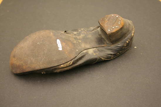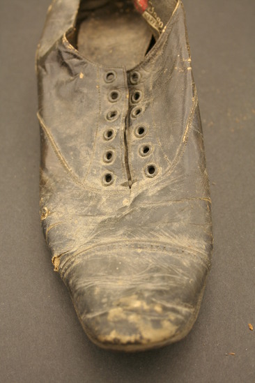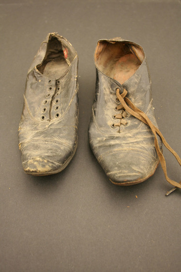 Pair of woman's work or utilitarian shoes; black leather; come to bottom of ankle; hand stitched; inside lined with black leather; brown machine made laces with metal capped tips only on left shoe, right shoe missing laces; label on interior instep of right shoe "The 14th Street Store/New York/Henry Siegel Press" the label is of black silk with street location in a red shield, all lettering in whtie; 1 1/2" heel on shoe; heel tapers from top to bottom; elongated, rounded toe