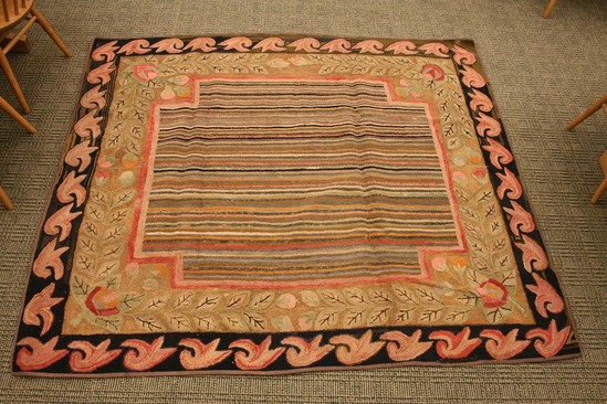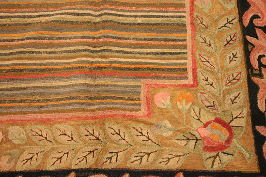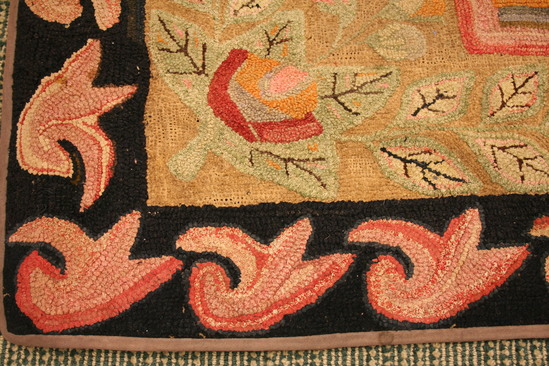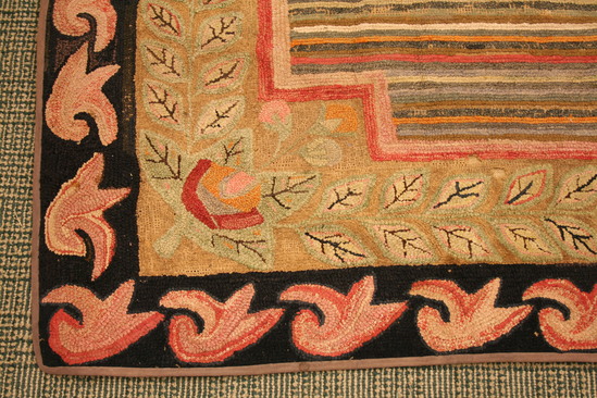 Wool hooked rug on linen ground. Center of rug has square area with corner's cut into of varoius colored stripes - random, no pattern. Exterior border black with repeating design of coral colored floral like swags. Interior border - vine design with leaves. Large flower in each corner with small buds in orange and pink yarn