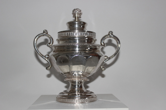Baluster form silver sugar bowl on pedestal foot. Stylized repeating leaf pattern around top and bottom of base, on rim, and on shoulder. Two double scroll handles. Dome cover lid with finial case to resemble a basket containing four distinct flowers. A "D" for Deming engraved on one side of body. "J.D.P." for Julius Deming Perkins engraved on the opposite side of the body. This sugar bowl is part of a five piece tea service given to Julius Deming Perkins by Lucretia Deming for his marriage in 1868. The date of the piece, engravings and family tradition indicate that the tea service was likely owned by Julius Deming during his life and was then passed down in the family. Estate inventories in the Litchfield Historical Society archives indicate that Julius Deming owned various pieces of silver, including a possible multi-piece tea service at the time of his death.