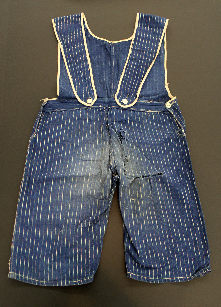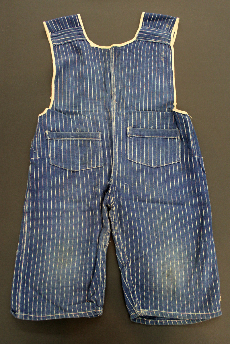 These overalls were worn by Oswald W. Marrin Jr. as a child. Oswald Wright Marrin Jr. (1919-2007) was born in New York City and lived in Litchfield. After graduating from Brown University in 1942 he joined the U.S. Marines. He was discharged in 1946. He worked at Scovill Manufacturing until 1951. He then took over the Marrin Real Estate company, which had been founded by his mother in 1930. He was the borough warden from 1967 to 1976. In 1984, he served on the Litchfield Citizen Advisory Committee which formed the town plan of development. He was a trustee of the Litchfield Historical Society, a member and past president of the Greater Litchfield Preservation Trust and of the Litchfield Country Club, a member of the Sanctum, and charter member of the Rotary Club.
