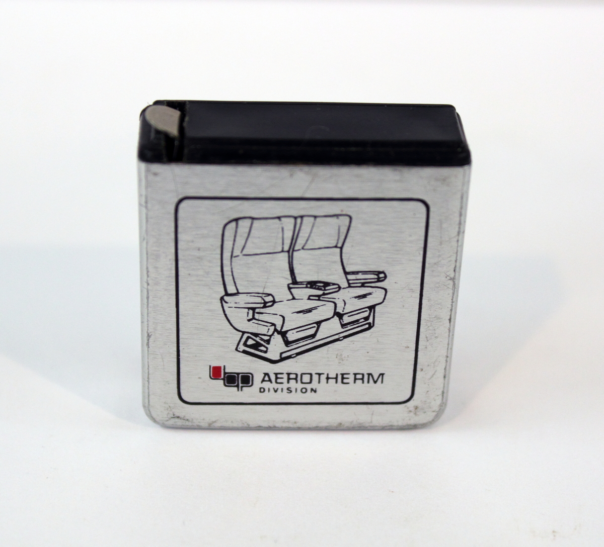 Square metal tape measure made for UOP, Aerotherm Division, Bantam, Connecticut. Brushed silver metal on five sides, with black plastic top; metal tape extends through slot in plastic. On the front, printed in black, is an image of two airline seats with text "AEROTHERM DIVISION/ UOP" set within black border.