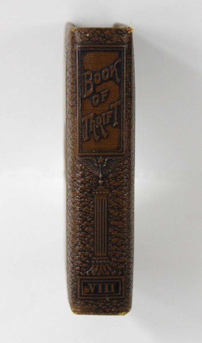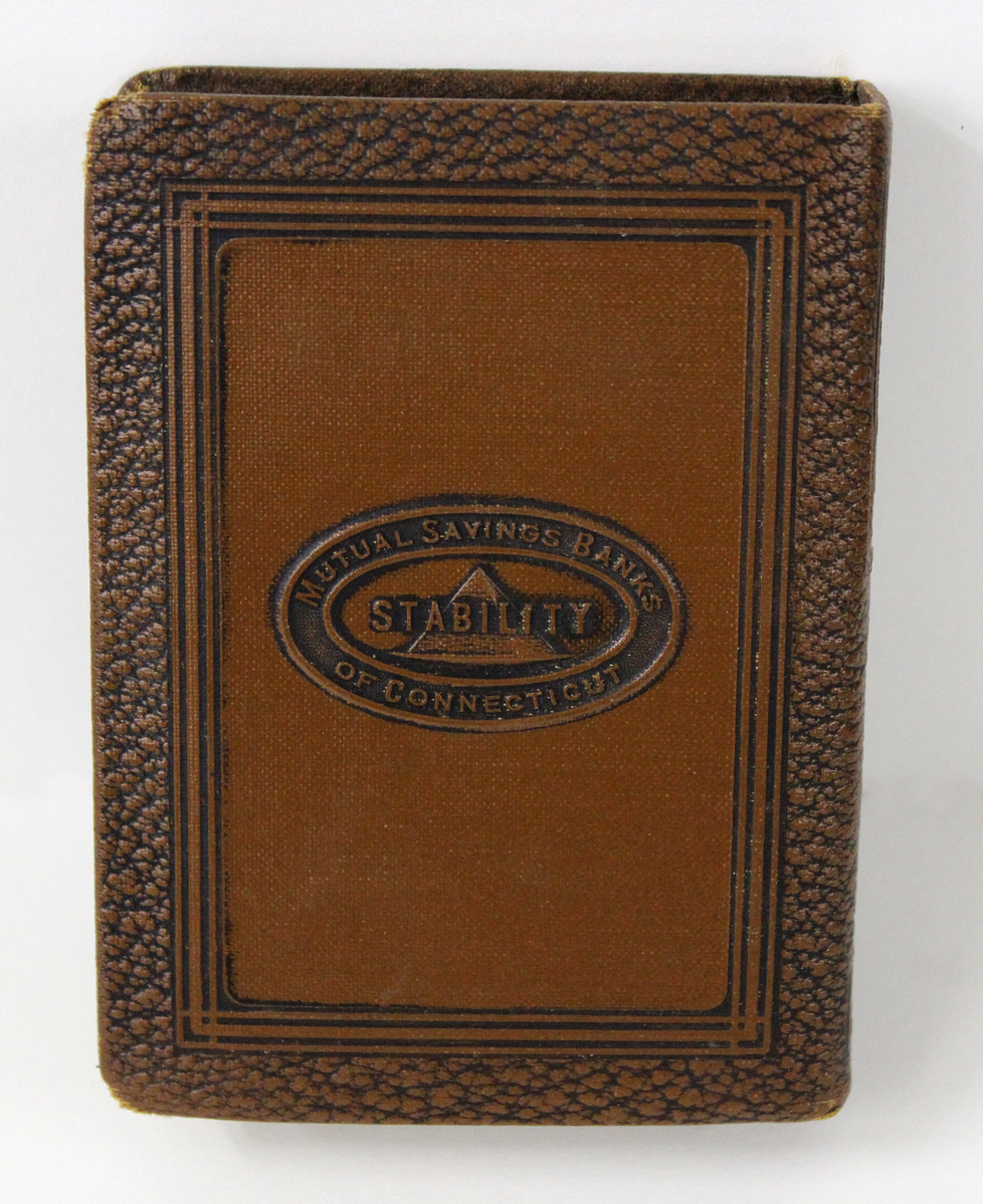 Souvenir book bank produced for the Litchfield Savings Society, Litchfield, Connecticut. Rectangular bank of gold metal with leather-bound cover, meant to resemble a book. Leather is heavily embossed and colored tan and dark brown. Front of the bank has an image of the bank building with text underneath, "THE LITCHFIELD/SAVINGS SOCIETY/LITCHFIELD, CONN."; reverse has text "MUTUAL SAVINGS BANK/OF CONNECTICUT" surrounding word "STABILITY" set in oval shape. The spine has text "BOOK OF THRIFT" above a column with winged capitol and numerals "VIII." Opening for coins at top with keyhole to right. Engraved on bottom, "BANKERs UTILITIES CO./SAN FRANCISCO/PATENTED/JULY 3, 1923/MADE IN U.S.A."