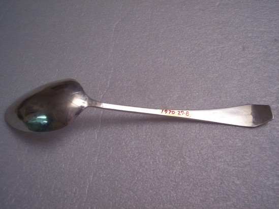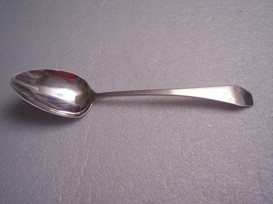 Large silver table spoon, Koval 1805 shape. Engraved with initials "EP" on handle. Hallmarked on back of handle "BEACH" in serrated rectangle