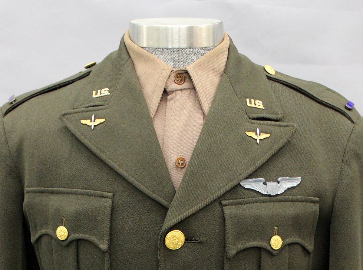 Tan wool twill shirt, U.S. Army Air Force service uniform. Pointed shirt collar, center front placket with tan plastic buttons. Double patch pockets at chest. Epaulets with buttons. Long sleeves with cuffs and buttons. Center-back yoke. Hand-written lettering on right front placket, "SJS/P417" and "[ ]/SJS."