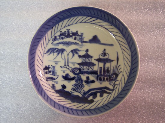 White saucer with blue-banded rim and an Asian scene of two houses, trees, and birds.