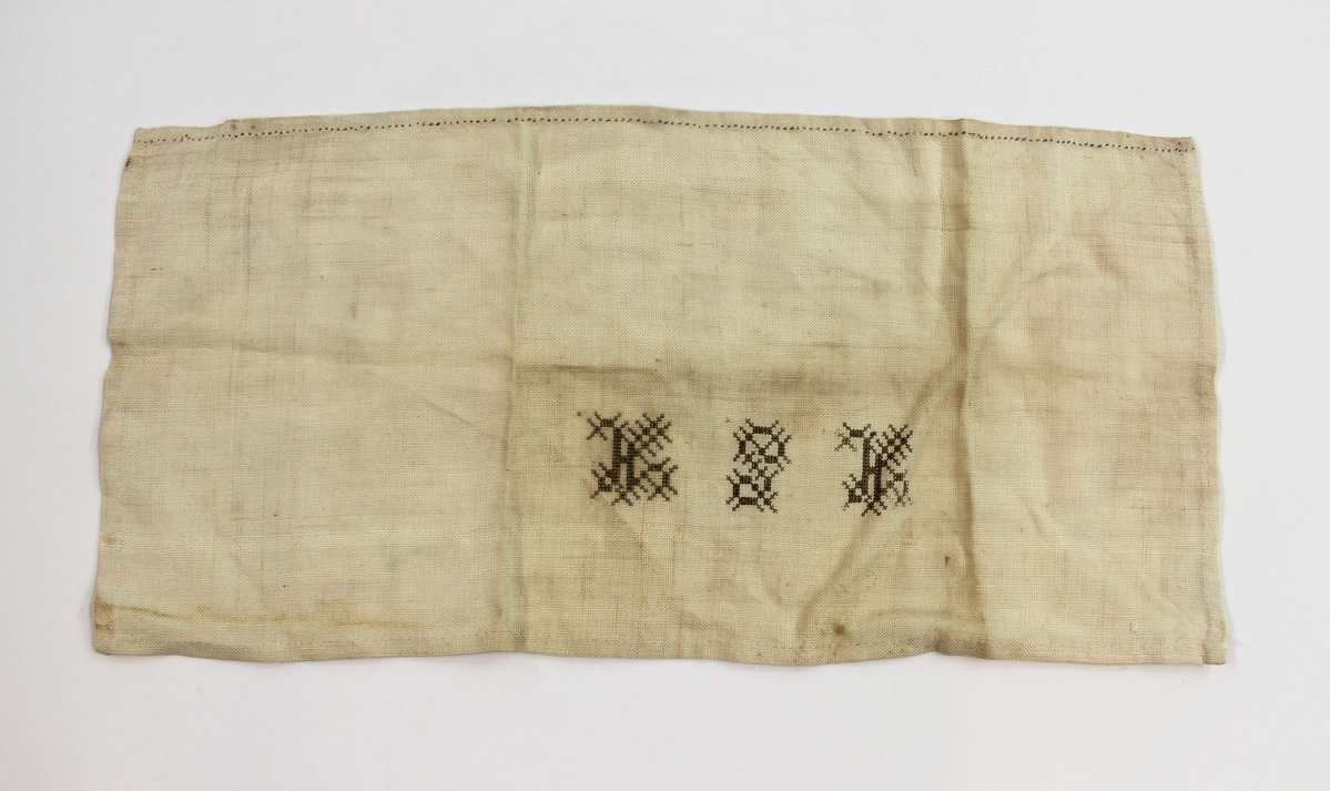 Rectangular linen napkin; cross-stitched in silk in center on one side, "HSH." Looks to be a fragment cut from a larger napkin, likely the same as 2007-17-14.