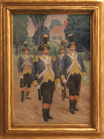 Small detail oil on canvas painting of "Putnam Phalanx on Litchfield Green." the work was painted from a photograph of the Putnam Phalanx that was taken by W.N. Copley on August 2, 1920, the State Day of the Litchfield Bicentennial. Seen in the painting are lines of men in blue uniform marching with swords and rifles.