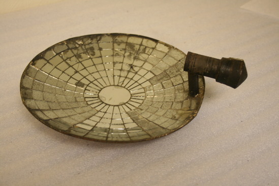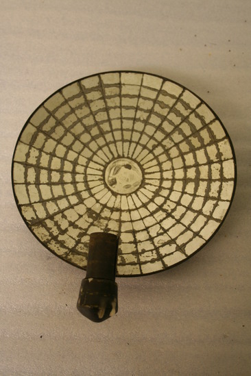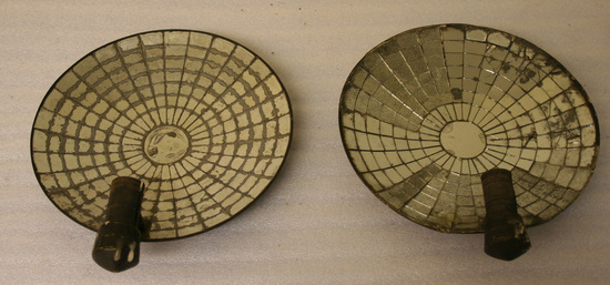 Circular reflectors made of pieces of varying sizes of glass fitted onto a tin backing; they are arranged in circles, diminishing in size to the middle which is a round piece. The back is made of two sections, one plate-like with a wide cap welded; the hanging devise is welded to this. The front candle holder is fastened through the bottom of the reflector by a hollow tin. All the tin was japanned in black and the hloder was lined with yellow paint (now missing).
