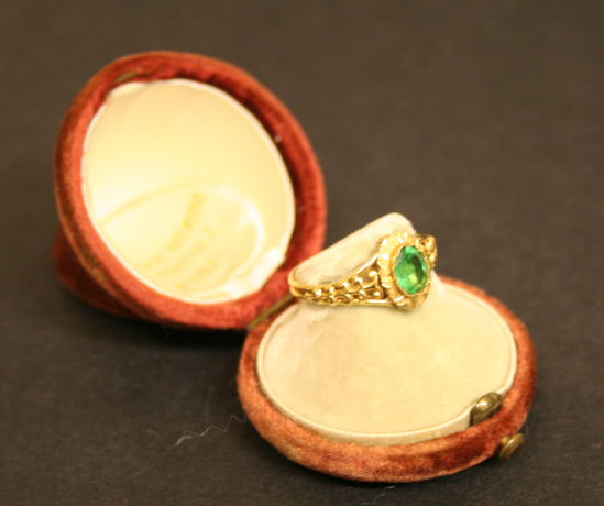 Ring and box. Gold ring with open work on band, oval mount set with facetted green glass or emerald, below mount is a microscope cylinder or tube, look inside to see a photographic image of a group of men entitled "Les Defenseurs de Italie" complete with a key to identify the men, which include the key figures in the Italian Liberation movement: Gen. Garibaldi, King Victor Emmanuel, Gen. Tracku, Gen. de Martisprey, etc.. The ring box is pink/red velvet with a rounded conical shape to top. Brass hinged lid. Lined with wite silk. Raised area on base for ring to rest. Label printed in gold lettering on inside of lid - Christophe Bremond/& Schoulz/Paris"