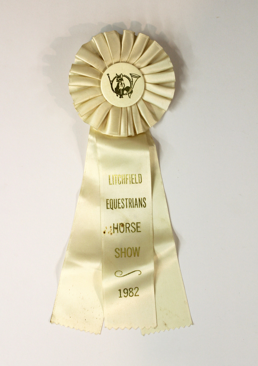 Off-white satin ribbon with rosette of off-white satin at top, circular button in center. Button stamped at center with image of fox and horn. Three satin tails extend below rosette, center one stamped with gold lettering, "LITCHFIELD/EQUESTRIANS/HORSE/SHOW/1982. Metal hook on reverse of rosette with white paper label with printed blue lettering, "CONGRATULATIONS/HODGES BADGE CO., INC. PORTSMOUTH, RI 02871 800-556-2440." Handwritten lettering, "Dutch Treat/Pleasure AM."