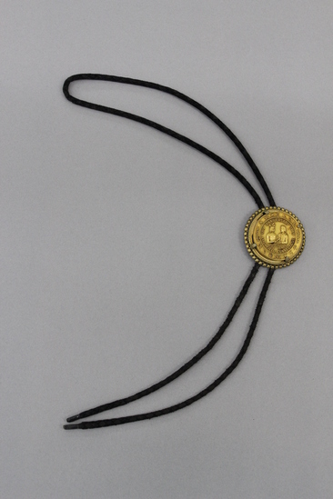 Bolo tie of black cord or braided leather with gold ornamental slide made from a commemorative coin from Litchfield's 250th anniversary as an incorporated town. The slide has a beaded gold border with four clasps holding the commemorative coin, with the side featuring a Native American and European settler facing outwards. Cord or braided leather has plastic tips. Coin dates from 1969.