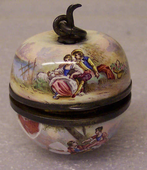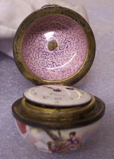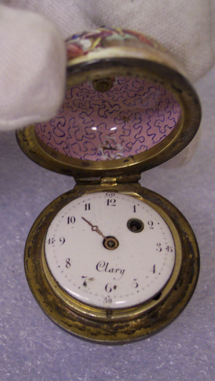 Case shaped like a round ball, outside ceramic painted in colorful pastoral scenes ofmen and women courting. Top of case has metal ring attached to it - watch could then be attached to a chain. Case opens in middle. Watch machinery and face sit inside one half of case. Face white enamel with Arabic numbers. "Clary" written on face of watch. Underside of case painted pink with blue swirls. Small hole in upper right hand corner of face of watch where key can be inserted.