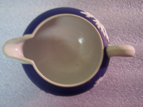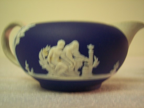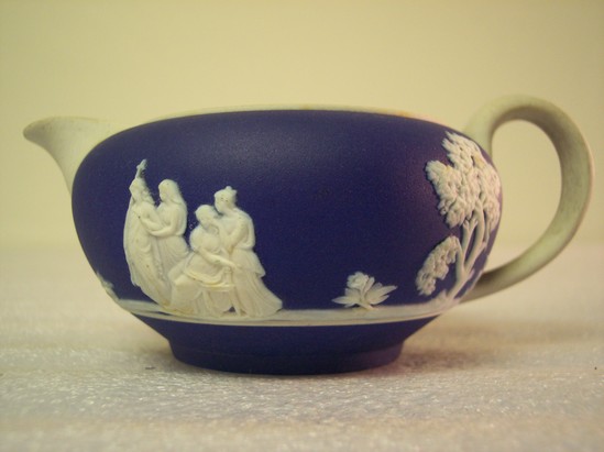 Blue jasper body with white ear-shaped handle. Round body. Simple, small, white spout. Classical figure decoration applied in white around body.