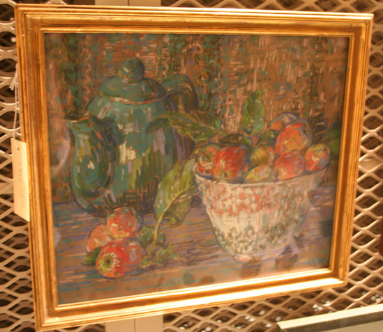 Still life of red apples in a white bowl. Green tea pot to left of bowl and neck of green glass bottle visible behind bowl. Picture created by series of vertical and horizontal dashes with pastel chalk. Very little blending. Framed under glass in wooden frame painted gold.