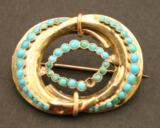 Gold and turquoise oval-shaped brooch, made from two hoop earrings in crescent moon shape, each set with graduated round turquoise, sodered together, pin backing added.