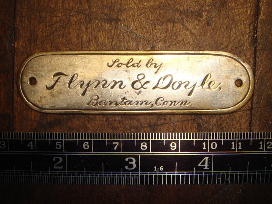 Nameplate for product sold by the Flynn & Doyle carriage company of Bantam, Litchfield, Connecticut. Rectangular metal nameplate with rounded ends, each end having a small screw or nail hole. Engraved on nameplate in cursive script is "Sold by Flynn & Doyle, Bantam, Conn." Flynn & Doyle produced carriages, sleighs, and wagons between 1876 and 1910. The Flynn & Doyle sleigh in the museum collection bears a similar nameplate, this one with squared ends and without the "sold by" text.