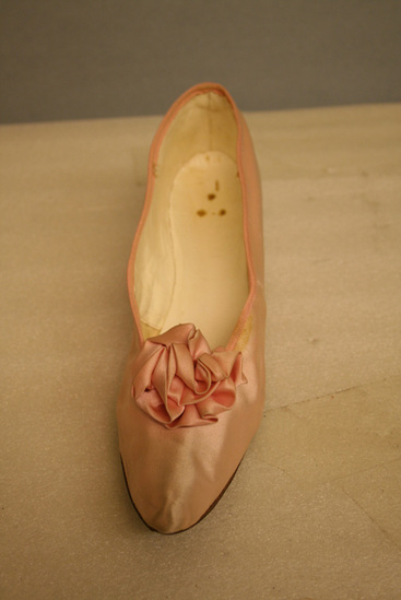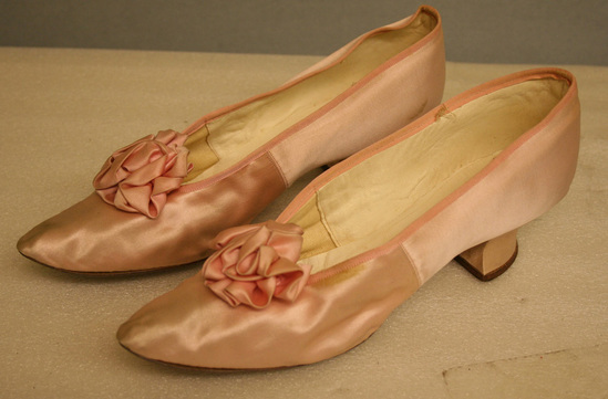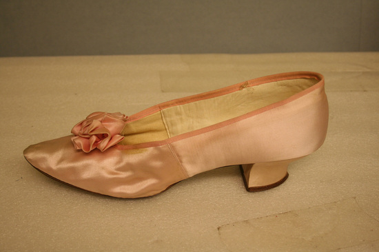 Pink satin shoes, gathered bows at front, square heel. Leather insole, lined with linen on inner sides of shoe. Slightly pointed toe. Pink satin binding.