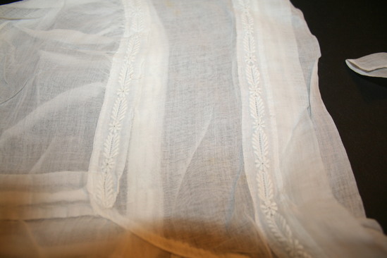 Plain mull poke style bonnet with plain ties, front, side, and back. Two vertical panels of leaf and flower embroidery vertically on front panel.