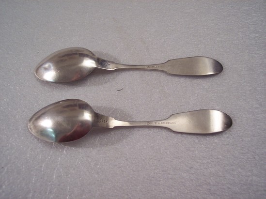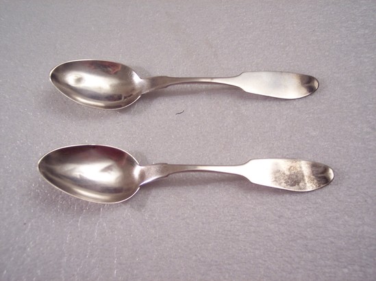 2 silver teaspoons, long oval bowl, straight hip, straight stem to shoulders and oval broad end. Hallmark on back of handle "COIN", star "F.A.SHEPARD"