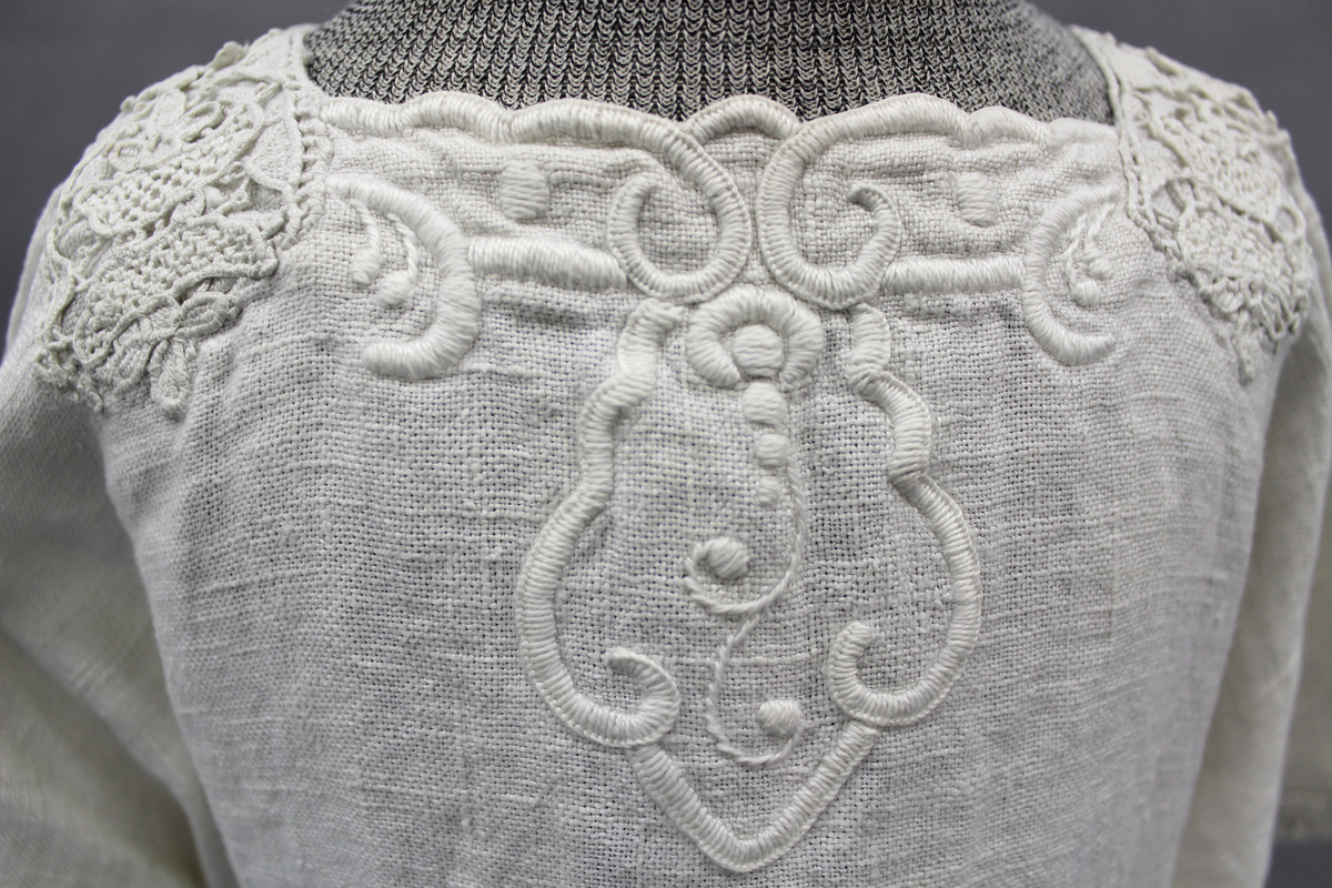 White linen child's dress; A-line; square neckline; short sleeves; embroidery and embroidered lace trim at neck, and sleeve edges; gussets under the arms; hem faced with cotton; center back opening with pearl buttons