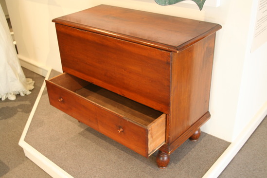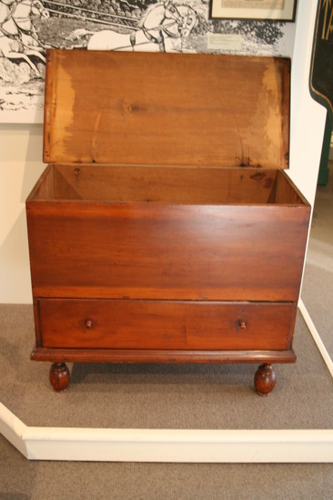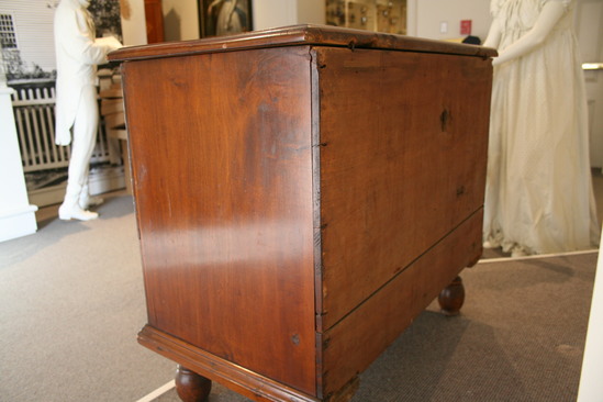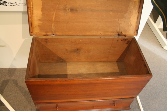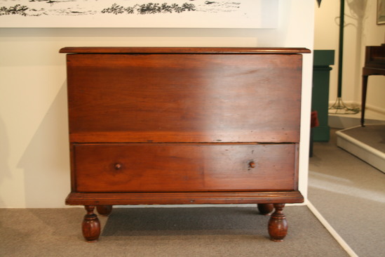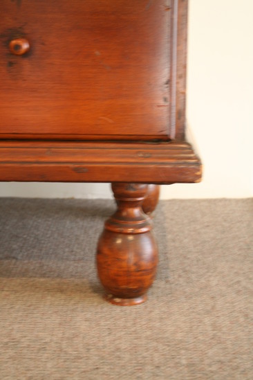 Chest over drawer with bulbous turned feet dowled into underside of chest. The pine lid has cotter pin hinges and a thumb nail molding on three sides. The drawer has thumb nail molded edges and wooden pulls. Around three sides is a bold molding nailed onto bottom