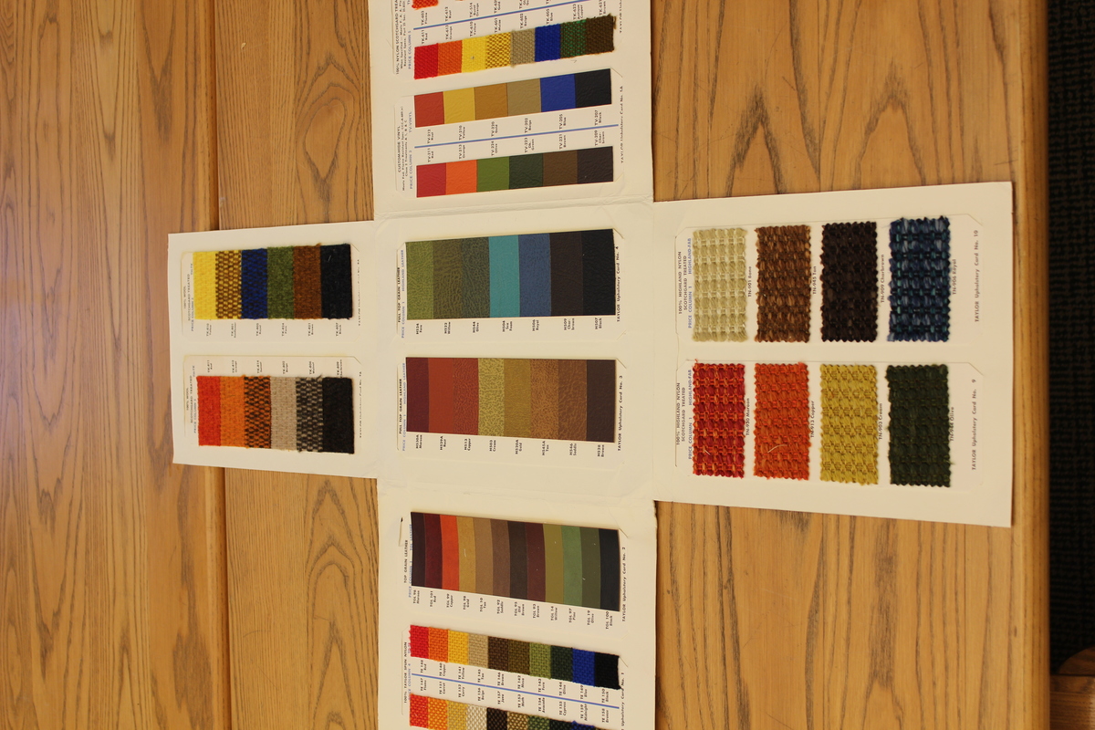 13 strips of multi-colored fabric swatches. Material samples used are 100% wool, 100% Taylor spun nylon, top grain leather, full top grain leather, custom-hide vinyl, 100% nylon scotchguard treated, and 100% Highland nylon scotchguard treated. There are 94 samples in the book all together. Marks: Manufacturer name and sample information
