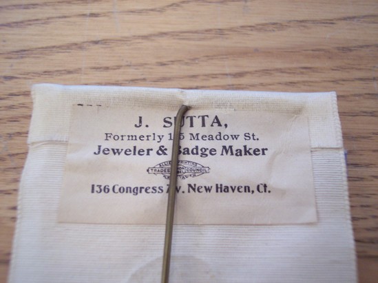 G.A.R. rectangular ribbon. Frayed at bottom. Off-white color. Small silk flag, cinched in middle with gold thread attached to top of ribbon. Profile of bearded gentleman underneath stamped on ribbon in gold. Underneath written in gold lettering: "Golden Anniversary / 19th Conn. Infty/Afterwards/2nd C.V.H.A ./ Annual Reunion/Camp Dutton / Sept. 11, 1912." On back is large silk metal pin. Maker's label glued on back, reads "J. Sutta /Formerly 15 Meadow St. / Jeweler and Badge Maker / 136 Congress Ave. / New Haven, CT"