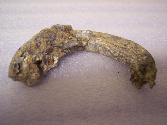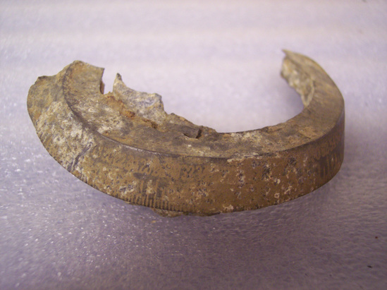 curved piece of metal. Side of piece has tick marks and numbers impressed into it.
