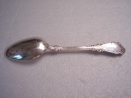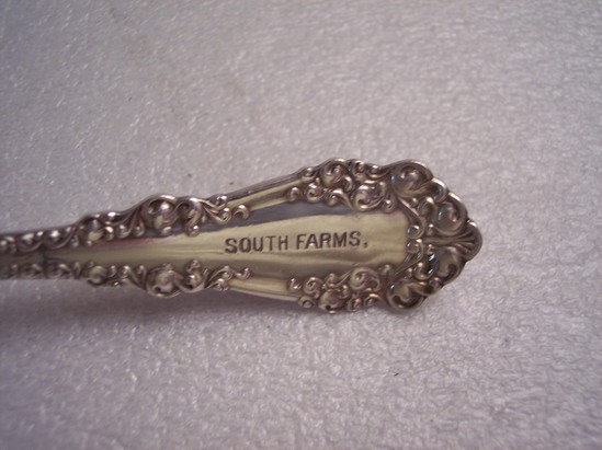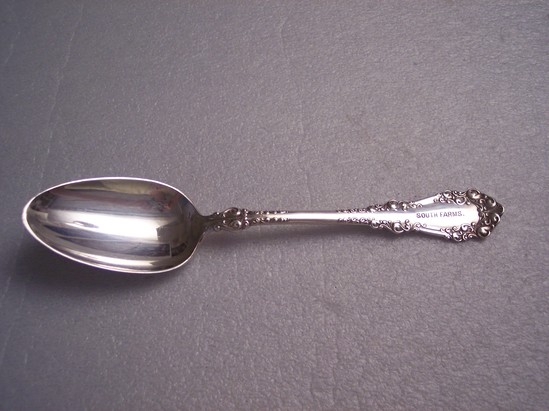 Large silver tablespoon. Edges of handle molded floral design - front and back. "South Farms" engraved on front of handle. "MERIDEN BRITA CO. XII" hallmark on back.