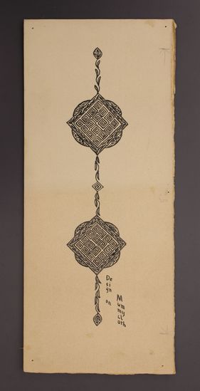 Illustration on board executed in pencil and black paint. Artwork depicts a geometric Egyptian design.