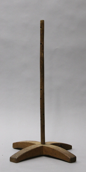X shaped wooden base with champhered edges; slightly arched in center. Extending up from center of base is a wooden pole with holes for pegs. Pegs are missing.