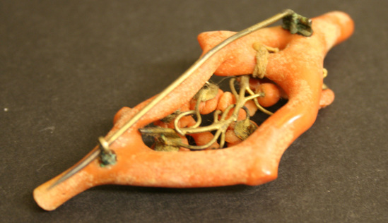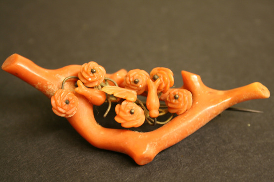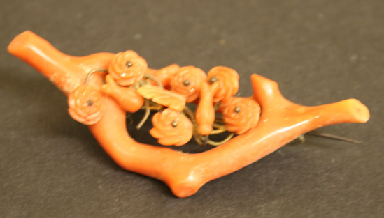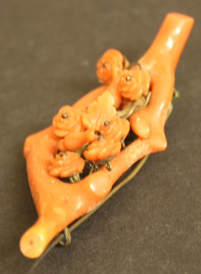 Red coral brooch - design of a pieces of wood covered in small flowers. Flowers connected and secured to brooch with gold wire. Bar pin on back