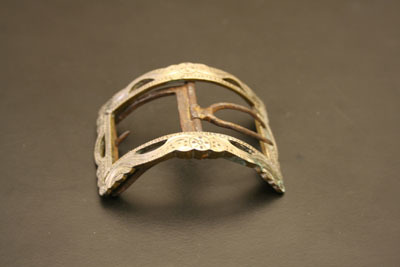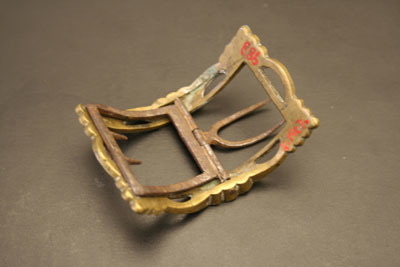 Single shoe buckle. Rectangular shape with rounded body. Buckle made of brass that has been silvered. Front of buckled etched with design. Voided areas on each sign incorporated into pattern. Center rod with two tongues. One tongue is U shaped with two long prongs. Other tongue is square shaped with two prongs pointed back towards center rod.