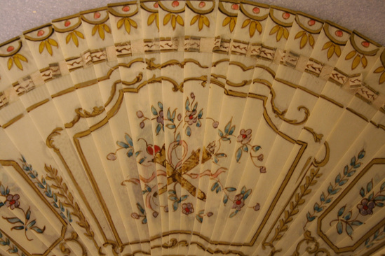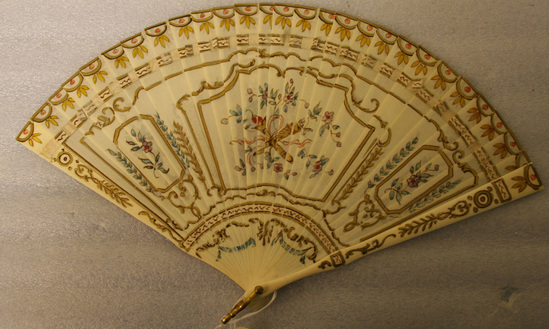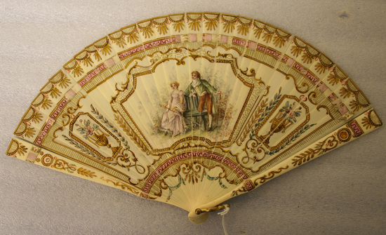 Fan - entire body made entirely of thin ivory sticks. Silk ribbon woven through top and bottom of fan to join sticks together. Ivory covered in polychrome decoration in oil paoint. On one side of fan - couple in regency dress in Sylvan landscape framed by gilt borders and cartouches. Around this scene are pink and gilt borders with laurel garlands. On reverse side of fan - polychrome floral decoration with gilt crossed torcheres.