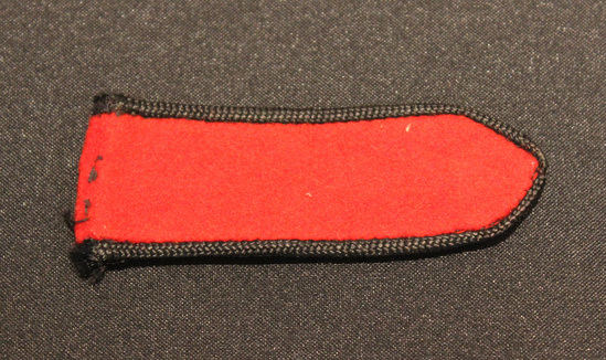 Three identical epaulet patches. Long, narrow patch coming to a point at the end. Patch made of red wool felt. Backed and bordered in black silk grosgrain ribbon.