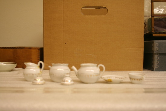 Doll's tea set of all white ceramic with gold lines and dots A - Tea pot with lid - 2 1/4" high B - Sugar Bowl with lid - 2 1/8" high with broken handle, lid mended C - Creamer - 1 1/2" high D-G - Saucers - 2" diameter H-K - Cups - 1 1/4" diameter