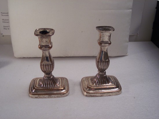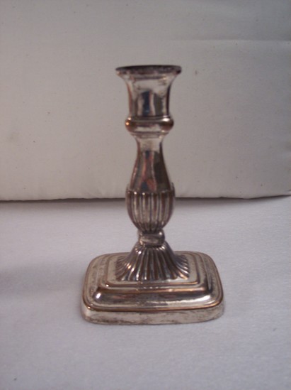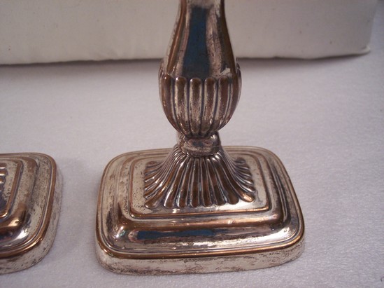 Pair of candlesticks. Copper oblong bases with round corners, round step platform with gadrooned dome, square knob, flared shaft with gadroon bottom half. Convex neck band, flared square holder, one with top and the other missing its top. Composition core of both candlesticks is rotten and falling out the bottom