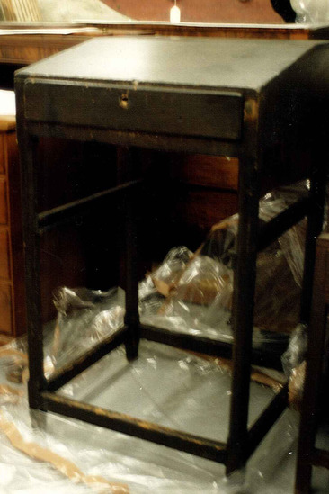 Pine, stained dark, lectern used by Judge Tapping Reeve in the Litchfield Law School. Based on its height, probably used with a stool. Plain stretcher base, square legs, two cross braces 3/4 way up legs, slanted desk top, body of desk with one long drawer, evidence of key hole.