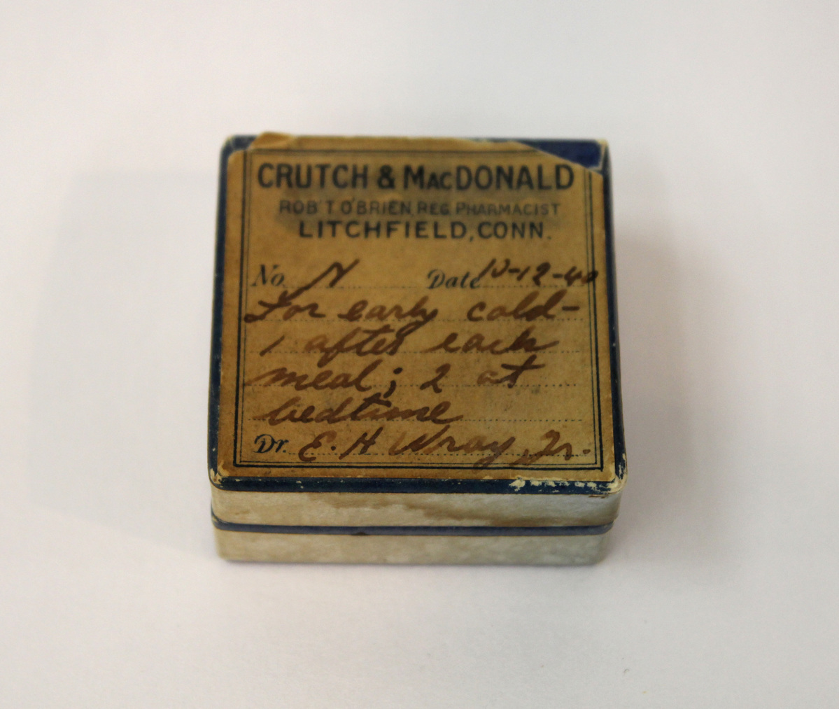 Square cardboard prescription box, dark blue exterior with textured, lighter blue paper overlaid. Interior of off-white. Top is hinged with blue fabric tape. Label on top, blue text on off-white paper, "CRUTCH & MacDONALD/ROB'T O'BRIEN, REG PHARMACIST/LITCHFIELD, CONN." Handwritten prescription information underneath.