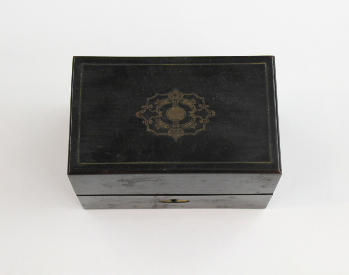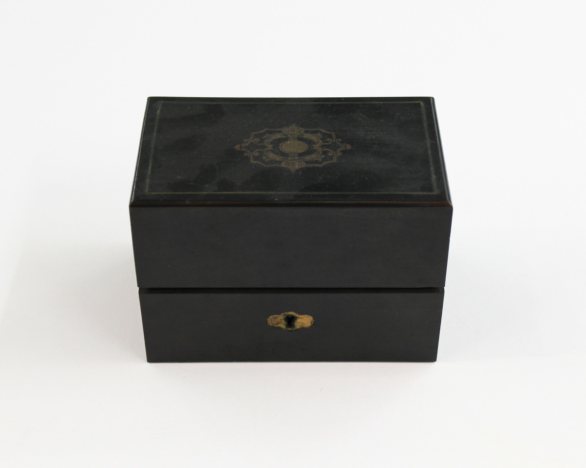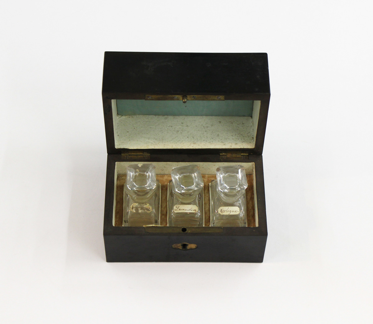 Wooden box containing three glass perfume bottles. Black lacquer box with gold inlay and exposed wood around key hole in front of box, likely from a missing piece of hardware. Design at center of box lid comprised of geometric patterns and scrolls; thin inlaid wood border on lid. Interior sides lined with white paper; interior of lid lined with blue silk; bottom of box lined with white velvet. Three cut glass bottles with rectangular bottom, rounded shoulders and octagonal cut lip; square cut glass stoppers. Two bottles retain original paper labels, "Lavender" and "Cologne."