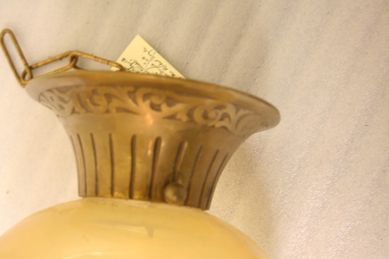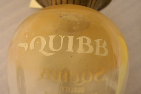 Decorative show globe for use in pharmacy or apothecary. Clear blown glass teardrop shaped globe. Cast brass top with brass link chain above. Painted on glass globe in white lettering "SQUIBB/Quality/Pharmaceutical"