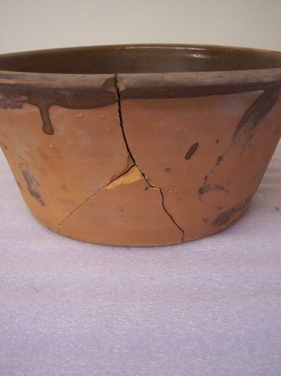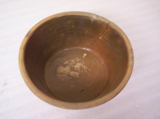 CLEAR GLAZED INTERIOR; UNGLAZED EXTERIOR. ROLLED RIM, PLAIN BASE, STRAIGHT SLANTED SIDES.