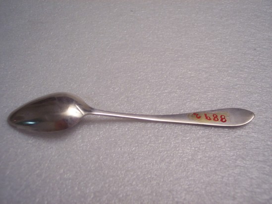 1 silver teaspoon, script "SLB" (?) on handle of spoon. Decorative etching on handle of spoon