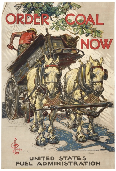 World War I era poster. Coal cart with two horses and man shoveling in back. "ORDER COAL/ NOW" in red letters at top. "UNITED STATES/ FUEL ADMINISTRATION" in black letter at bottom.